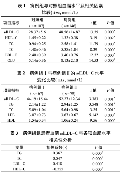 齊齊哈爾醫學院附屬第三醫院的楊秀靜等[6],將146例T2DM患(其中男85例,女61例;年齡30~70歲)中單純T2DM患者67例為病例組Ⅰ,T2DM及并發癥患者79例為病例組Ⅱ;另選擇同期健康體檢者107名作為對照組。兩組均進行sd LDL-C、GLU、TC、TG、LDL-C、HDL-C檢測。觀察T2DM及其并發癥患者血清中sdLDL-C水平變化情況并分析其臨床應用價值。研究結果表明,sd LDL-C在T2DM患者中升高明顯,sd LDL-C與TG、TC、LDL-C呈正相關與HDL-C呈負相關。觀察sd LDL-C的變化情況可用于預測T2DM并發癥病變發生風險。