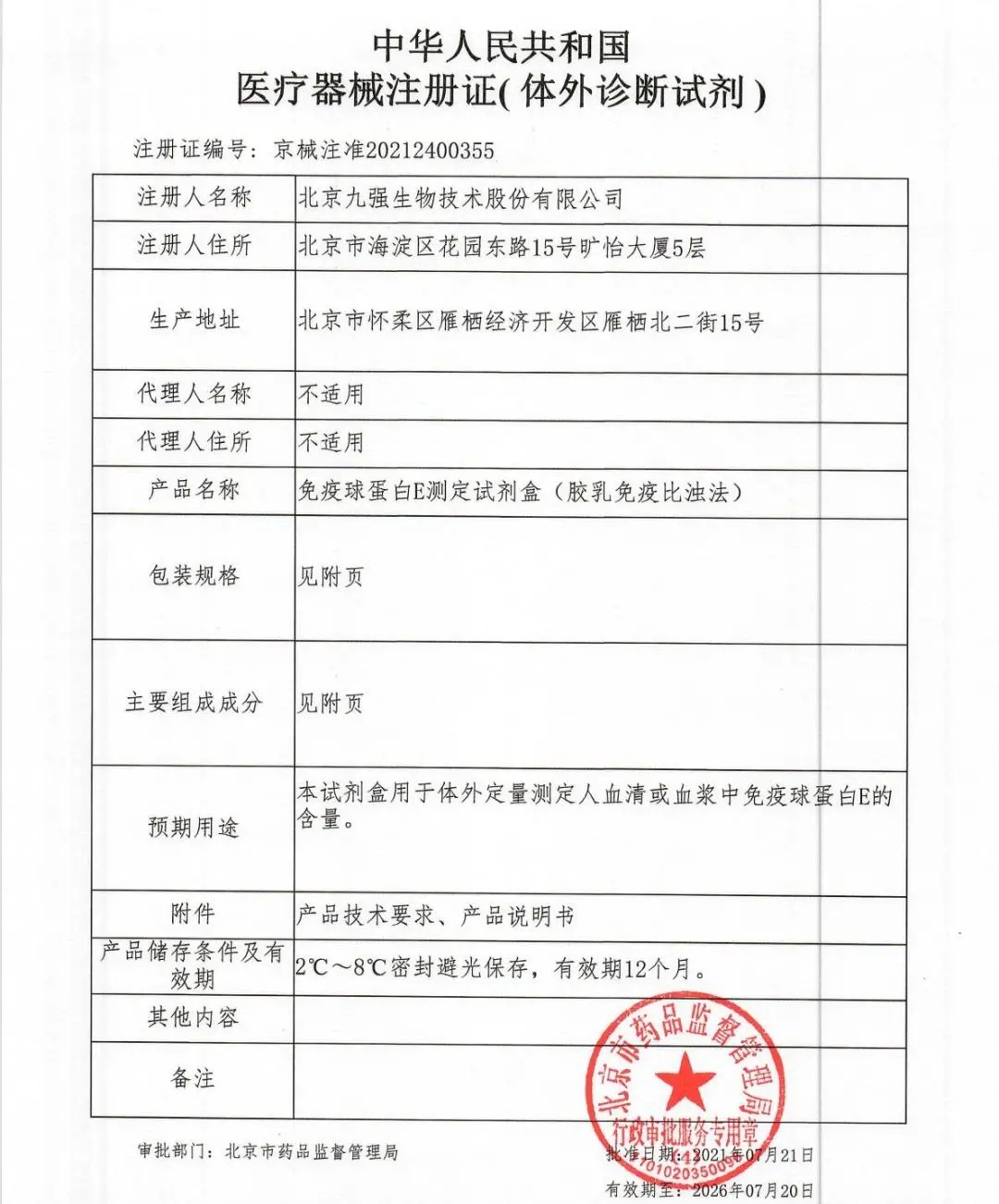 九強生物順利取得國家藥品監督管理局頒發的免疫球蛋白E測定試劑盒(膠乳免疫比濁法)的《醫療器械注冊證》。