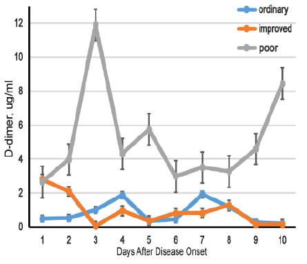 南京醫科大學從湖北省三家醫院招募了279例COVID-19患者進行研究,結果顯示:入院時,改善組和惡化組的D-二聚體水平高于普通組。經治療,改善組D-二聚體水平逐漸降低,而惡化組由于病情沒有得到有效控制,D-二聚體仍保持較高水平,說明D-二聚體水平的動態變化與COVID-19的預后呈現出一定的相關性[4]