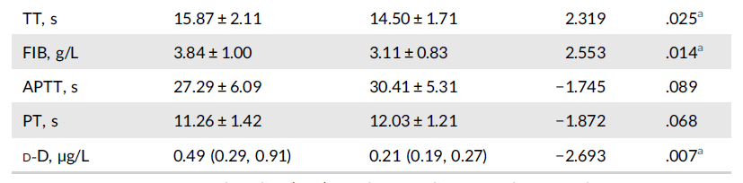 血漿D-二聚體是交聯纖維蛋白在纖溶酶的作用下水解產生的特異性降解產物,主要反映纖維蛋白的溶解功能,是確定體內有無血栓形成及繼發性纖溶的特異性指標之一,也是反映凝血與纖維蛋白溶解活化的分子標志物[2]