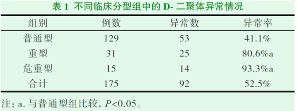 對武漢雷神山醫院收治的175例成人新型冠狀病毒肺炎患者進行研究,以D-二聚體值>0.55mg/L 為異常,結果表明:重型、危重型患者D-二聚體異常率顯著高于普通型組,且危重型患者D-二聚體水平明顯高于重型和普通型,提示可將D-二聚體作為評價成人COVID-19的嚴重性指標[6]