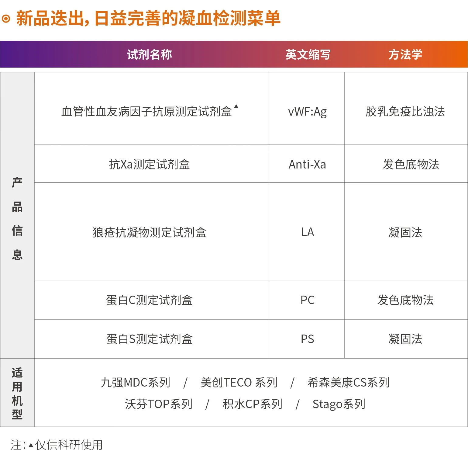 九強(qiáng)生物是中國(guó)領(lǐng)先的臨床體外診斷產(chǎn)品與服務(wù)供應(yīng)商之一,目前擁有自主研發(fā)的全自動(dòng)凝血檢測(cè)分析儀MDC7500和MDC3500以及德國(guó)原裝進(jìn)口的Coatron5000、Coatron3000和Coatron1800,專業(yè)配套的凝血檢測(cè)試劑在滿足自有檢測(cè)系統(tǒng)的同時(shí)也能完美匹配主流血凝檢測(cè)系統(tǒng),滿足不同客戶的需求,為臨床提供全面的血栓與止血實(shí)驗(yàn)室解決方案。