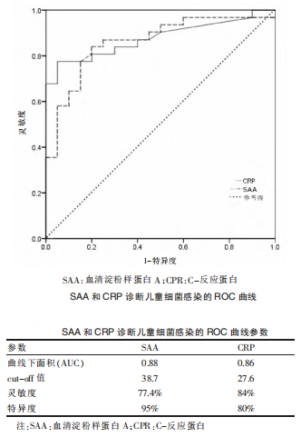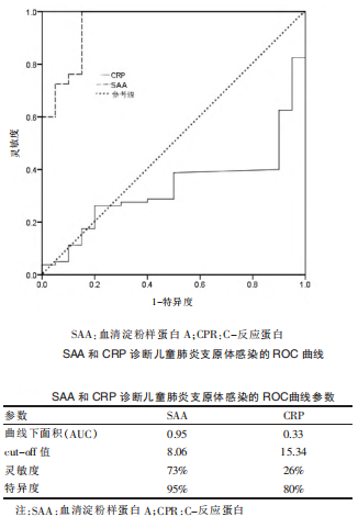 李攀等[3]探討血清淀粉樣蛋白A(SAA)和C-反應蛋白(CPR)檢測對兒童支原體肺炎的診斷價值。包括支原體感染患兒124例(支原體感染組)、細菌感染患兒35例(細菌感染組),同期健康體檢兒童20例(對照組),分別測定和分析三組SAA和CRP水平,并應用ROC曲線進行分析。結果表明:SAA檢測對診斷兒童肺炎支原體感染和細菌感染的準確性均較高;CRP檢測對診斷兒童細菌感染準確性較高,但對于鑒別診斷兒童肺炎支原體的意義較小。SAA 檢測可用于兒童肺炎支原體感染的鑒別診斷,應在臨床中廣泛應用。