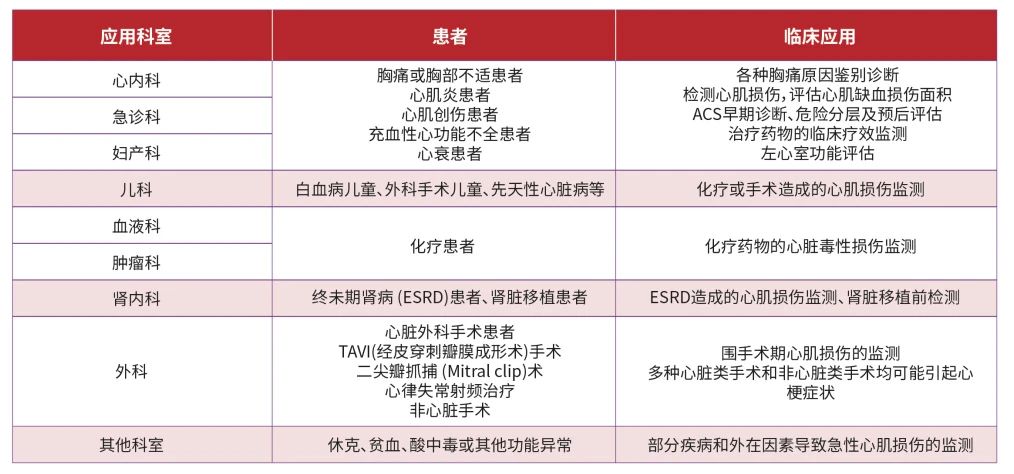 心臟細胞胞質中含量豐富,具有高度心臟特異性,AMI發作后20min開始升高,1~3h內可以在血中檢測出,4~6h達到峰值,20~30h內血漿中的濃度恢復正常水平,其釋放量與心肌損傷范圍成正比。