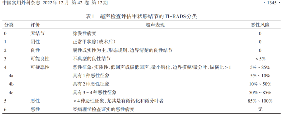 TI-RADS(Thyroid imaging reporting and data system)即甲狀腺影像報告和數據系統。依據五個甲狀腺結節惡性特征進行分級:①實性結節;②低回聲或極低回聲;分葉或邊緣不規則;④砂礫樣鈣化;⑤縱橫比≥1。