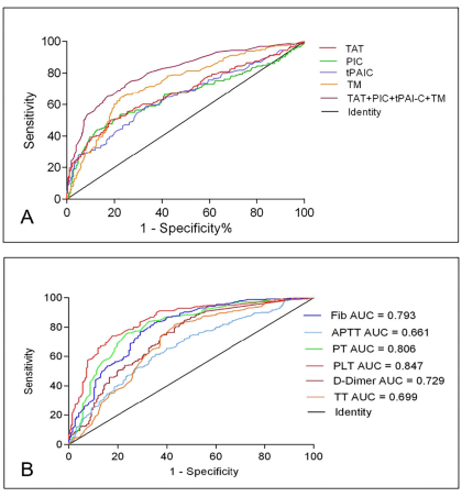 一項多中心前瞻性觀察研究表明TAT、PIC、tPAIC和sTM在不同基礎疾病的DIC患者中表現出良好的診斷性能和預后價值,TAT、tPAIC和sTM在pre-DIC的診斷具有一定的意義。此外,新血栓四項聯合檢測可增加AUC、靈敏度和優勢比,具有更高的檢測效能,有助于及時干預。