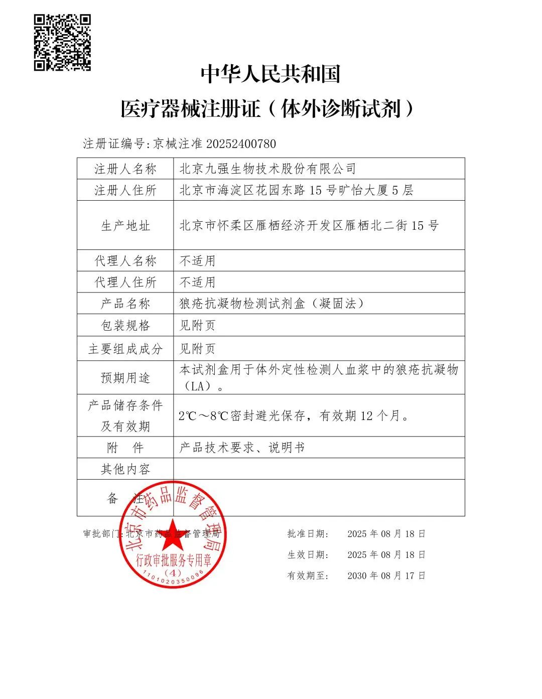 近日,九強(qiáng)生物狼瘡抗凝物檢測試劑盒(凝固法)順利取得國家藥品監(jiān)督管理局頒發(fā)的《醫(yī)療器械注冊(cè)證》(注冊(cè)證號(hào):京械注準(zhǔn) 20252400780)。