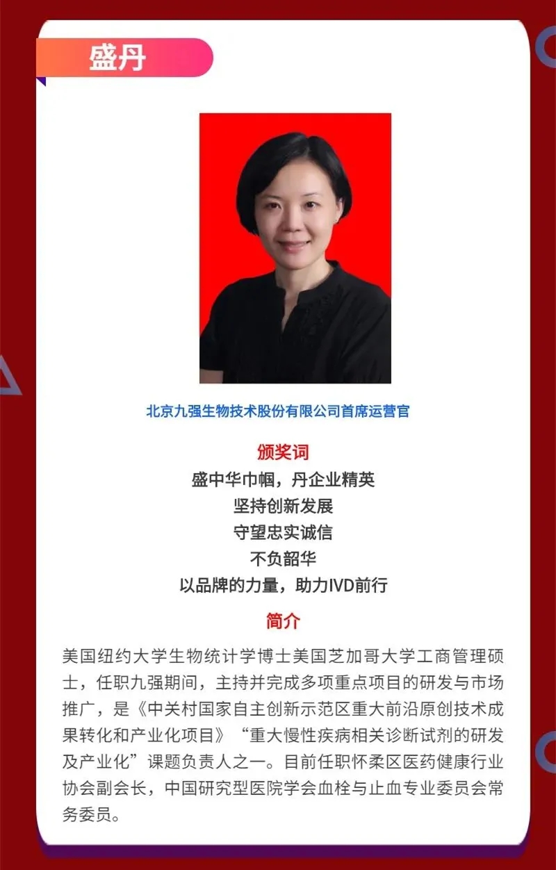 為表彰和銘記、激勵和感謝為人民健康事業做出貢獻的我國體外診斷生產和流通企業家們的辛勤努力及拼博奉獻精神。2020年“中國體外診斷產業領軍人物”評選活動于2020年12月9日正式啟動?;顒庸彩盏綐I界知名專家,行業協會推薦的32位企業精英申報參評。依據評選辦法,聯合發起單位篩選出符合評選條件的候選人14名。經過層層評選與投票,最終僅有8位同志榜上有名。其中九強生物首席運營官盛丹女士獲此殊榮!